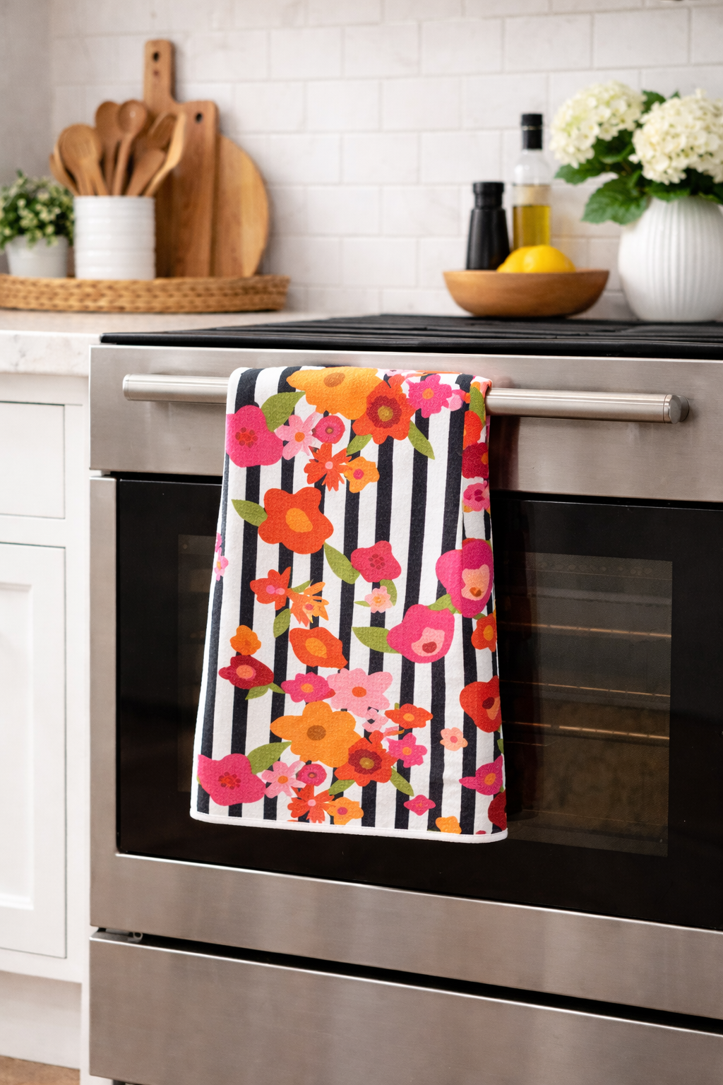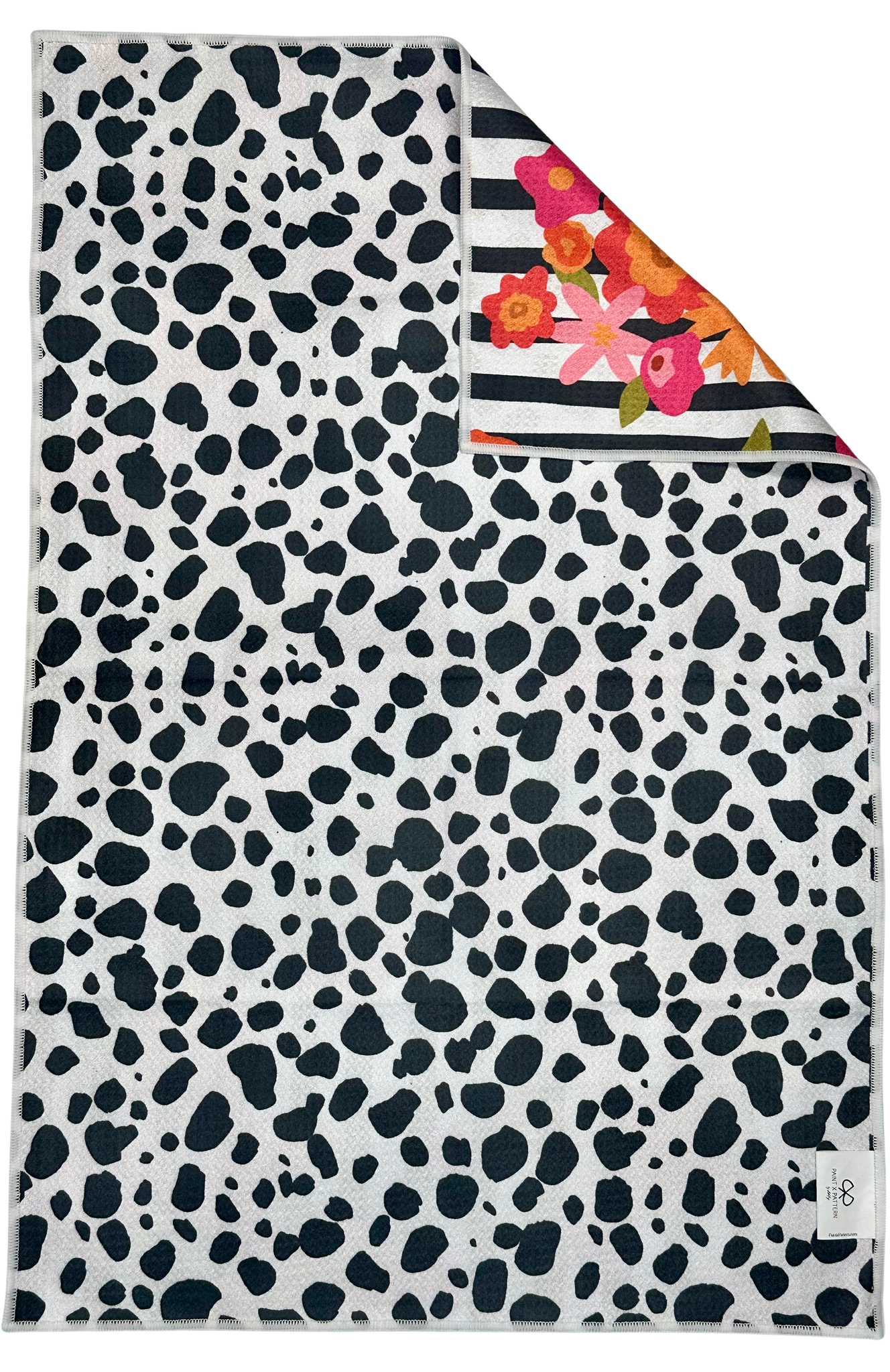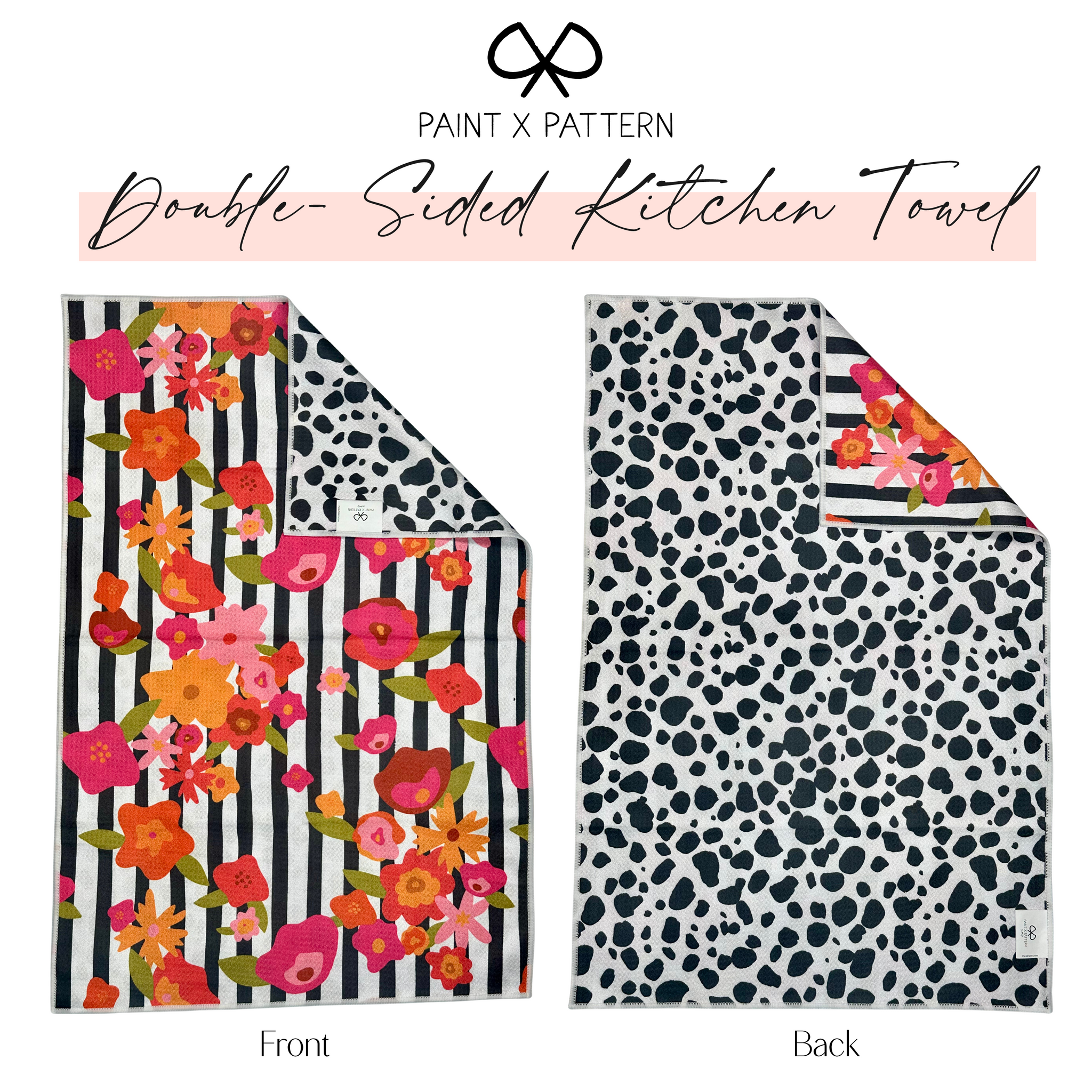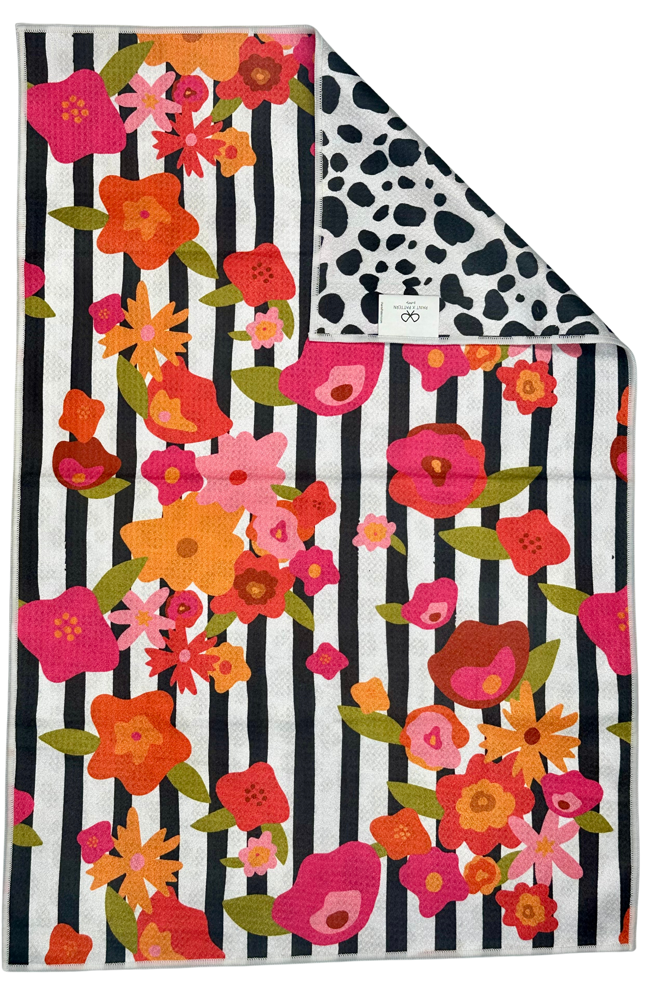 Meet your new favorite kitchen towel. Designed to be as hardworking as it is beautiful, this 20 x 30 inch double-sided towel features two bold designs in one — a vibrant floral stripe on one side and a modern black-and-white hand painted Dalmatian spots on the other.